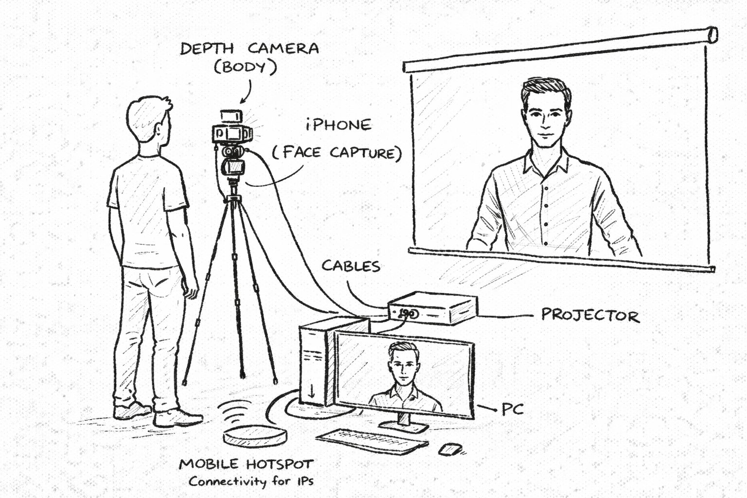 This phase involved independent research and development, integrating unconventional and cross-disciplinary tools into a unified Unreal Engine workflow. The resulting system supported real-time digital doubles driven by standard webcams, consumer cameras and optional depth sensors, while remaining fully portable and rehearsal-room viable.